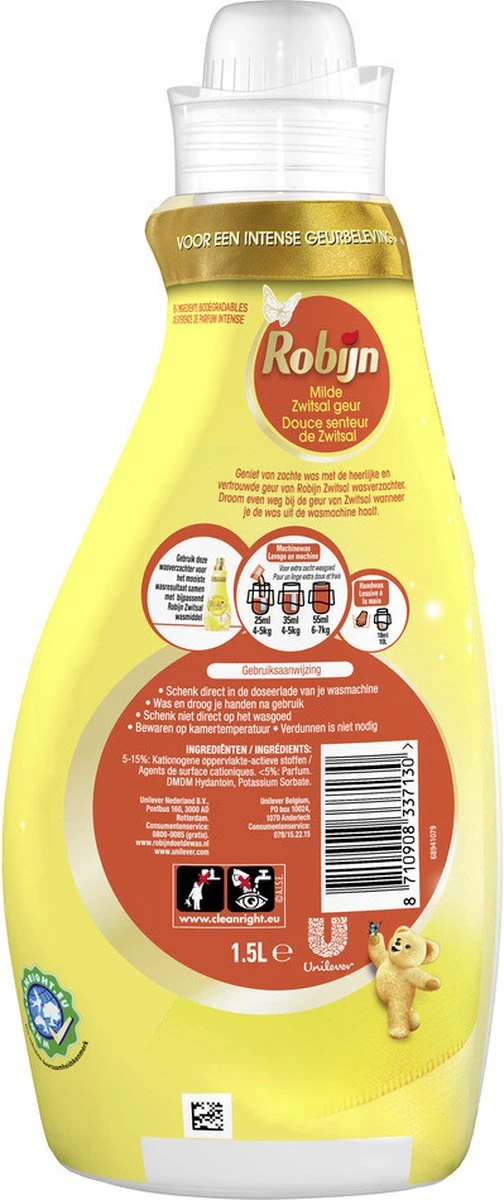 Laat je verrassen door de heerlijke geur van Robijn Collections Zwitsal wasverzachter. Robijn heeft de geur van deze Collections wasverzachter verbeterd, zodat je kunt genieten van zacht wasgoed en een nóg betere geurervaring. De wasverzachter combineert de milde, unieke geur van Zwitsal met de zachtheid die je van Robijn wasverzachters kent. De wasverzachter is lichtgeel van kleur en ruikt naar de herkenbare geur van Zwitsal. Je was ruikt door de wasverzachter van Robijn niet alleen heel lekker, maar het middel zorgt ook voor een speciale beschermlaag rondom de vezels van de stof. Dit zorgt ervoor dat er minder wrijving ontstaat tussen de vezels, met als gevolg dat je kleding zijn kwaliteit behoudt doordat het minder snel slijt en zijn pasvorm en kleuren behoudt. Daarnaast is je kleding makkelijker strijkbaar door de wasverzachter en droogt het sneller. De Robijn Collections Zwitsal wasverzachter bevat ingrediënten die voor 95% biologisch afbreekbaar zijn. De resterende 5% is om de kwaliteit en veiligheid van het product te garanderen. Hierdoor blijft je kleding heerlijk zacht en zorg je tegelijkertijd beter voor het milieu. Combineer met het bijbehorende Robijn Collections Zwitsal wasmiddel om zo lang mogelijk te genieten van alle stralende kleuren en heerlijke geuren in je kast.